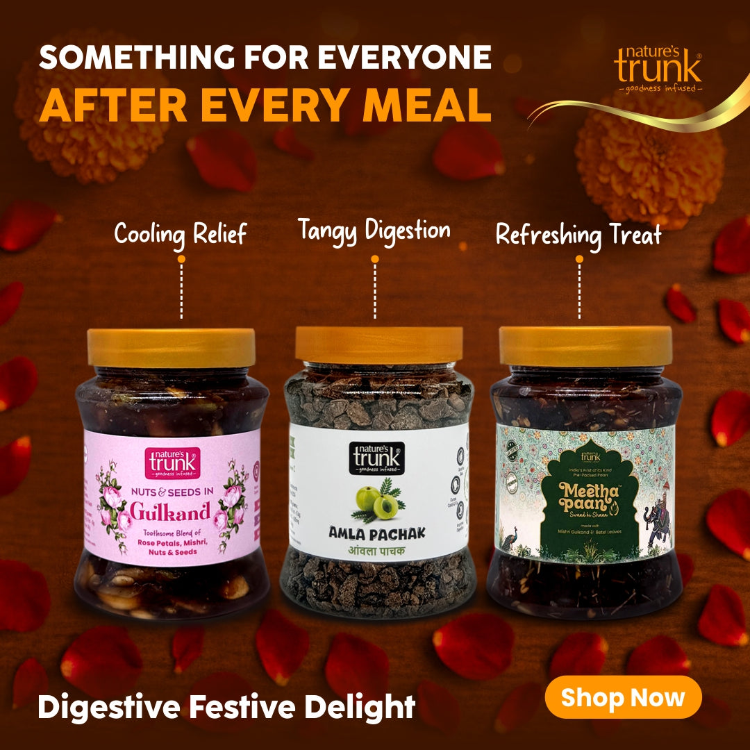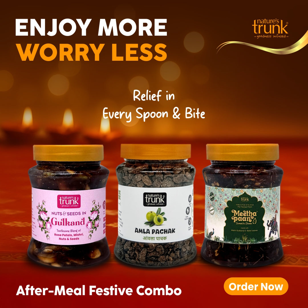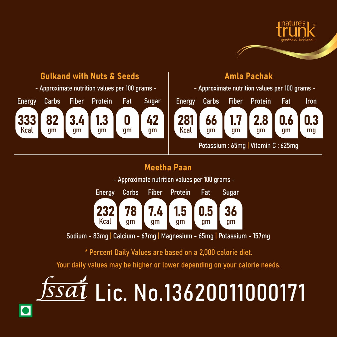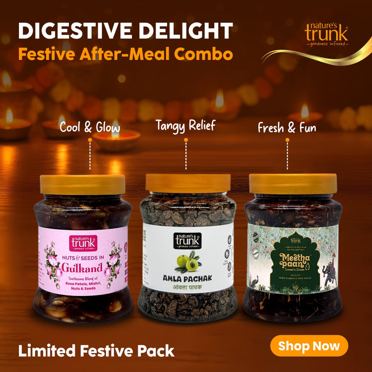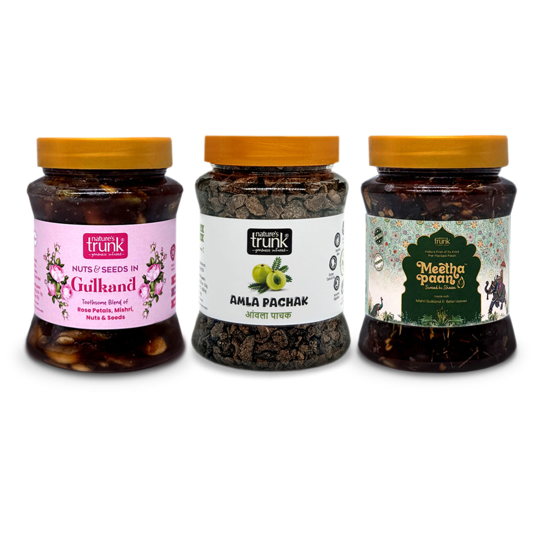 Our Digestive Delight Combo brings together three authentic after-meal favourites — Gulkand with Nuts & Seeds, Meetha Paan, and Amla Pachak.
