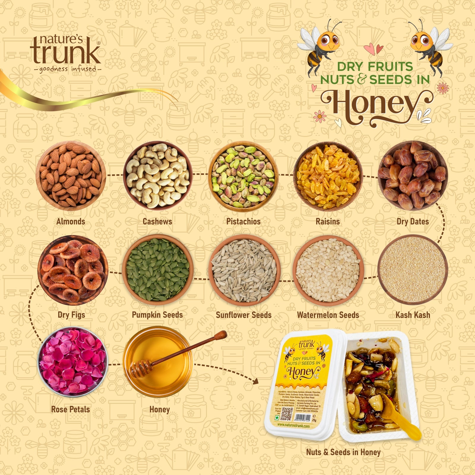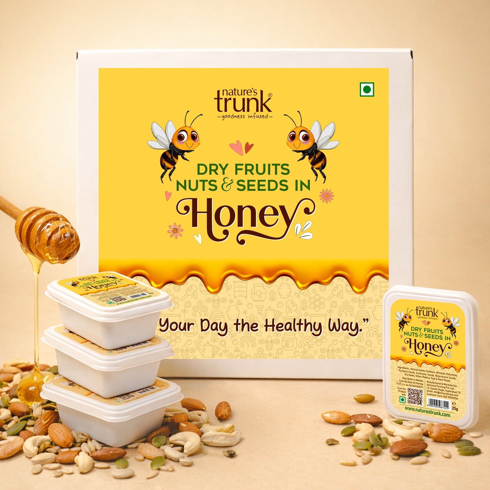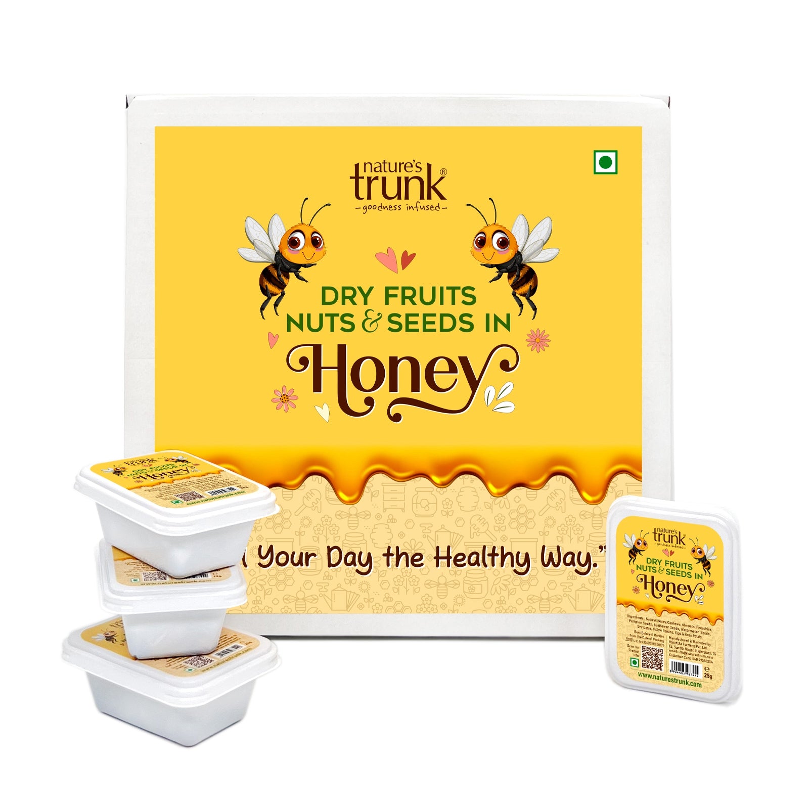 Power your day with Nature’s Trunk Dry Fruits, Nuts & Seeds in Honey (Pocket Packs)— a premium mix of almonds, cashews, pistachios, sunflower seeds,watermelon seeds, Pumpkin seeds, raisins, dried Anjeer, dried dates,dried rosepetals, kashkash and pure natural honey in convenient 25g packs. Whether it’s school time, office hours, or travel, this ready-to-eat snack is designed for quick, natural energy anytime. Delicious, wholesome, and easy to carry, it’s a smart alternative to everyday snacking.