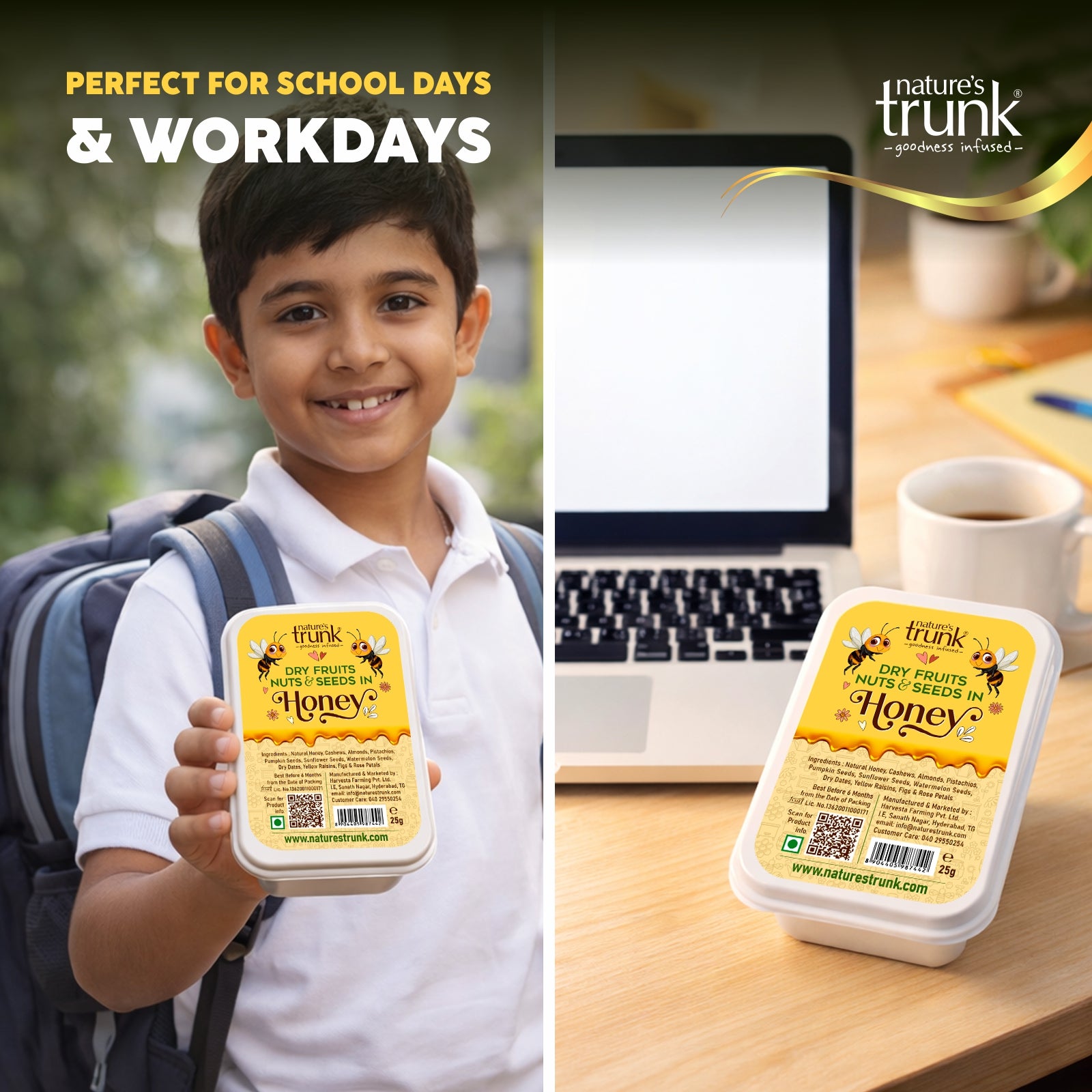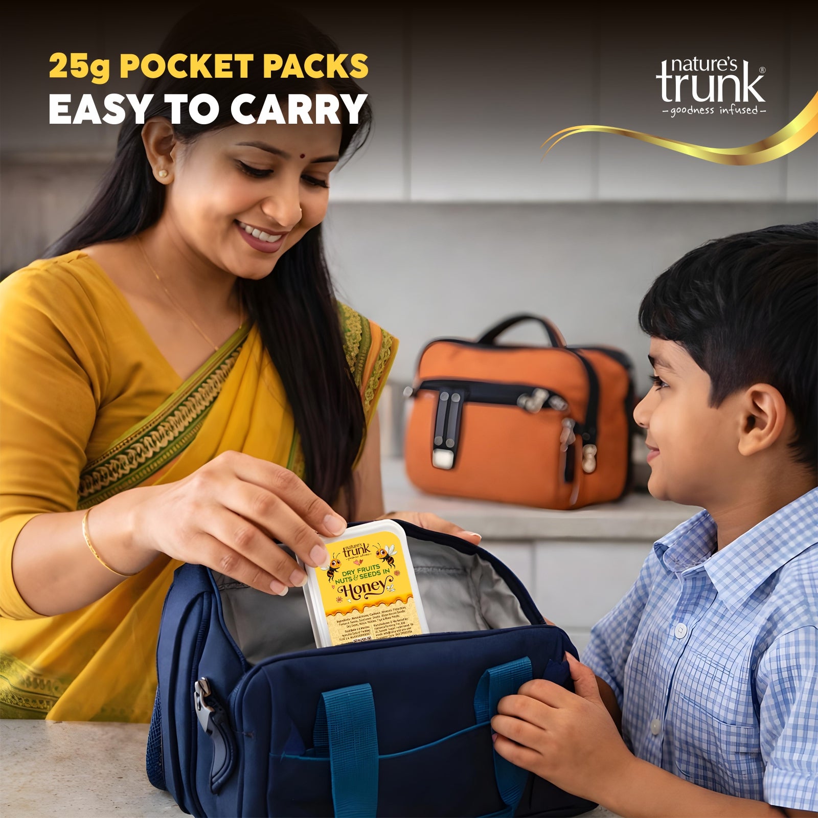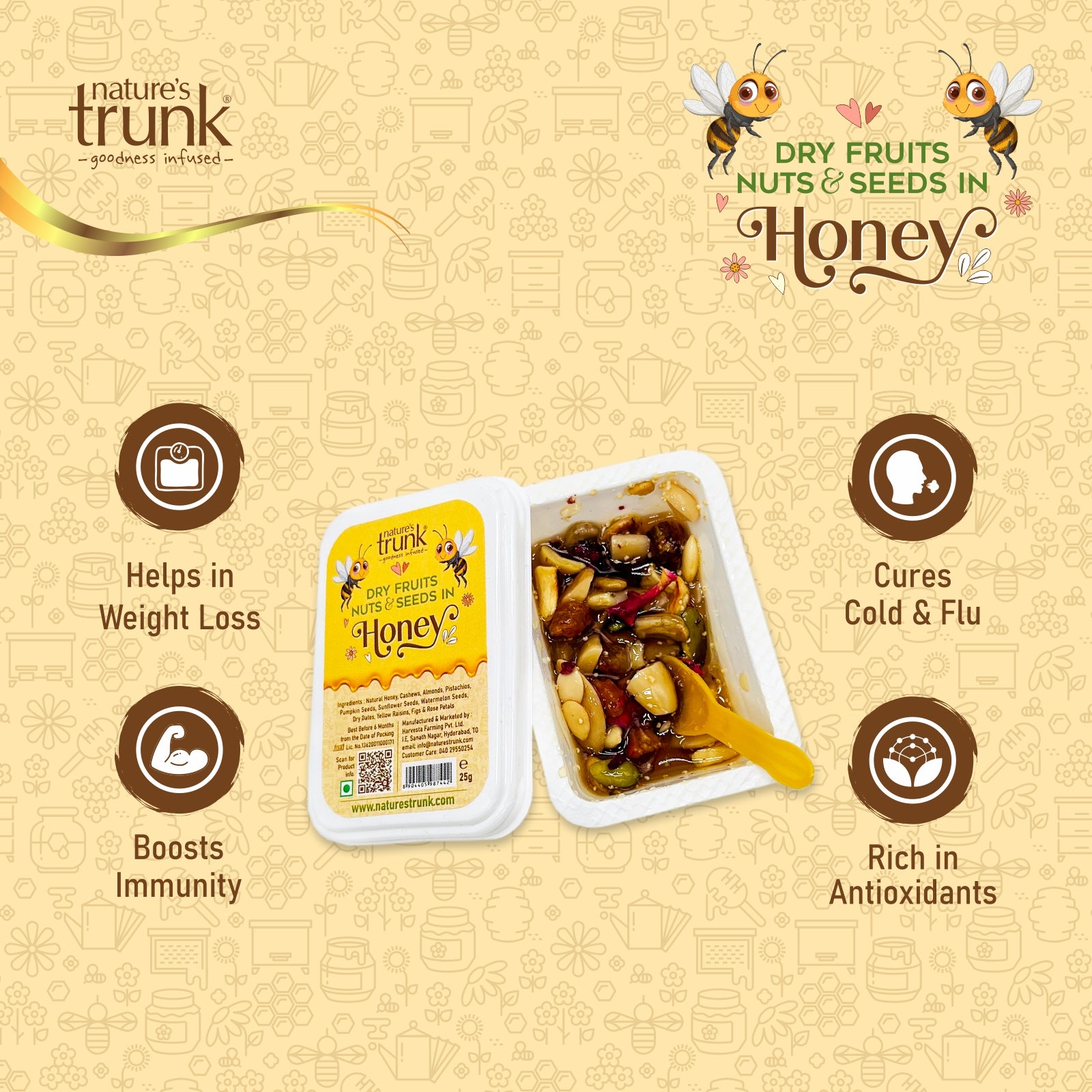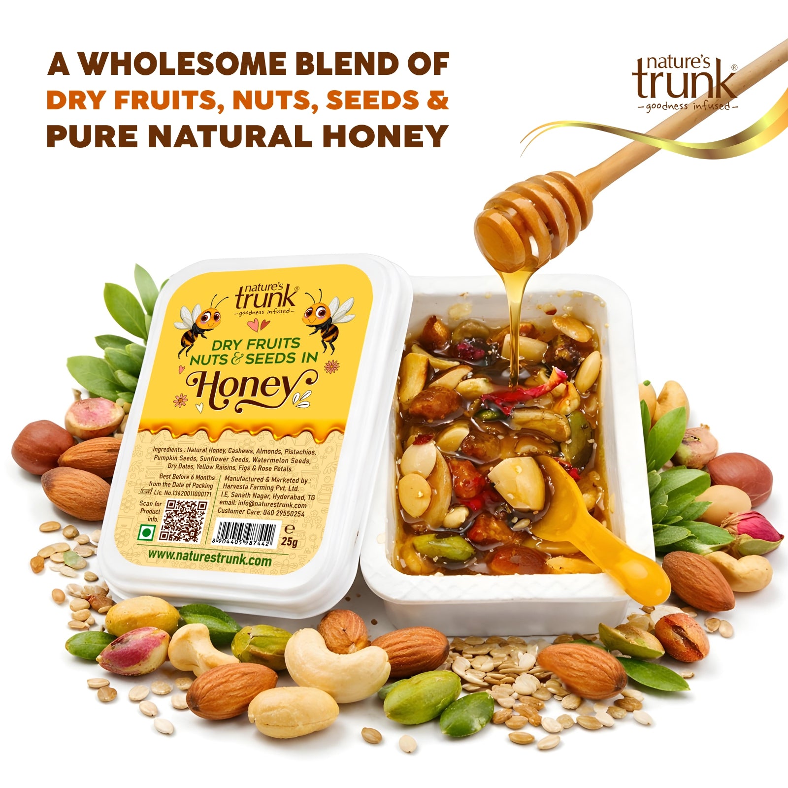 Power your day with Nature’s Trunk Dry Fruits, Nuts & Seeds in Honey (Pocket Packs)— a premium mix of almonds, cashews, pistachios, sunflower seeds,watermelon seeds, Pumpkin seeds, raisins, dried Anjeer, dried dates,dried rosepetals, kashkash and pure natural honey in convenient 25g packs. Whether it’s school time, office hours, or travel, this ready-to-eat snack is designed for quick, natural energy anytime. Delicious, wholesome, and easy to carry, it’s a smart alternative to everyday snacking.