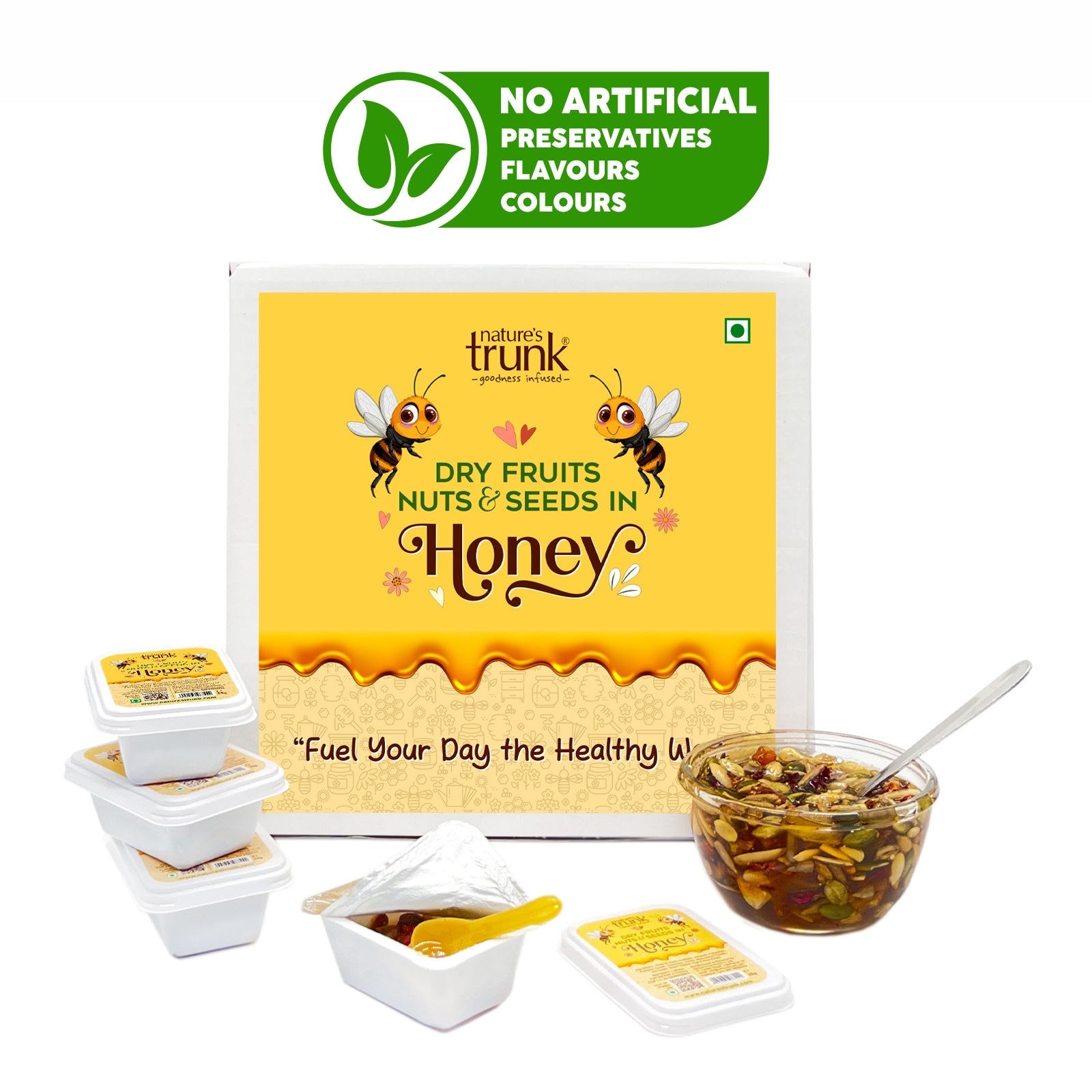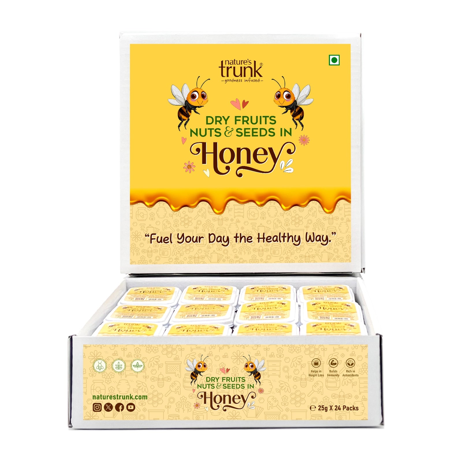 Nature’s Trunk Dry Fruits, Nuts & Seeds in Honey is a premium blend of Dryfruits, Nuts, Seeds, and Pure Natural Honey, packed in convenient 25g single-serve portions. Ready to eat and easy to carry, it’s the perfect natural snack for busy days, school breaks, or office hours. Enjoy a delicious, wholesome bite anytime, anywhere.