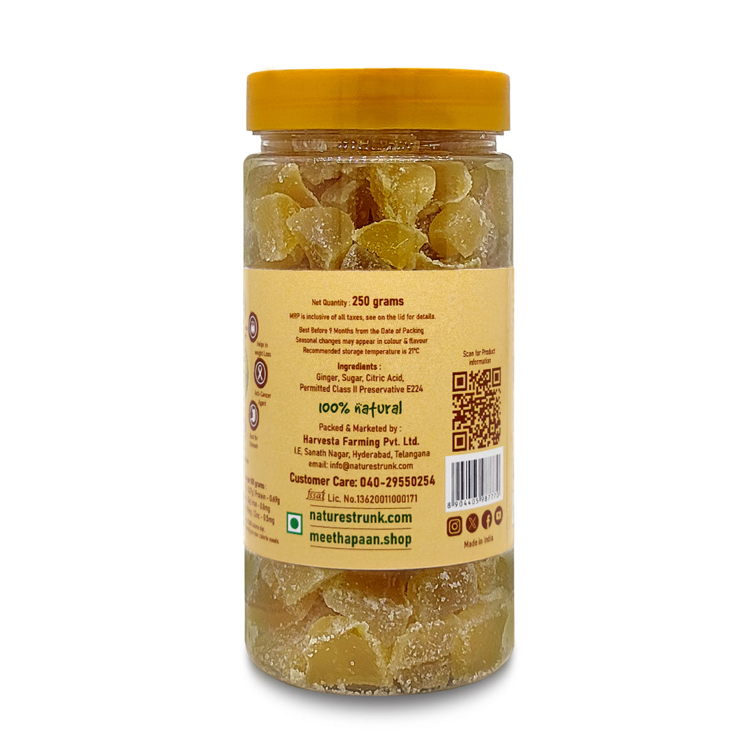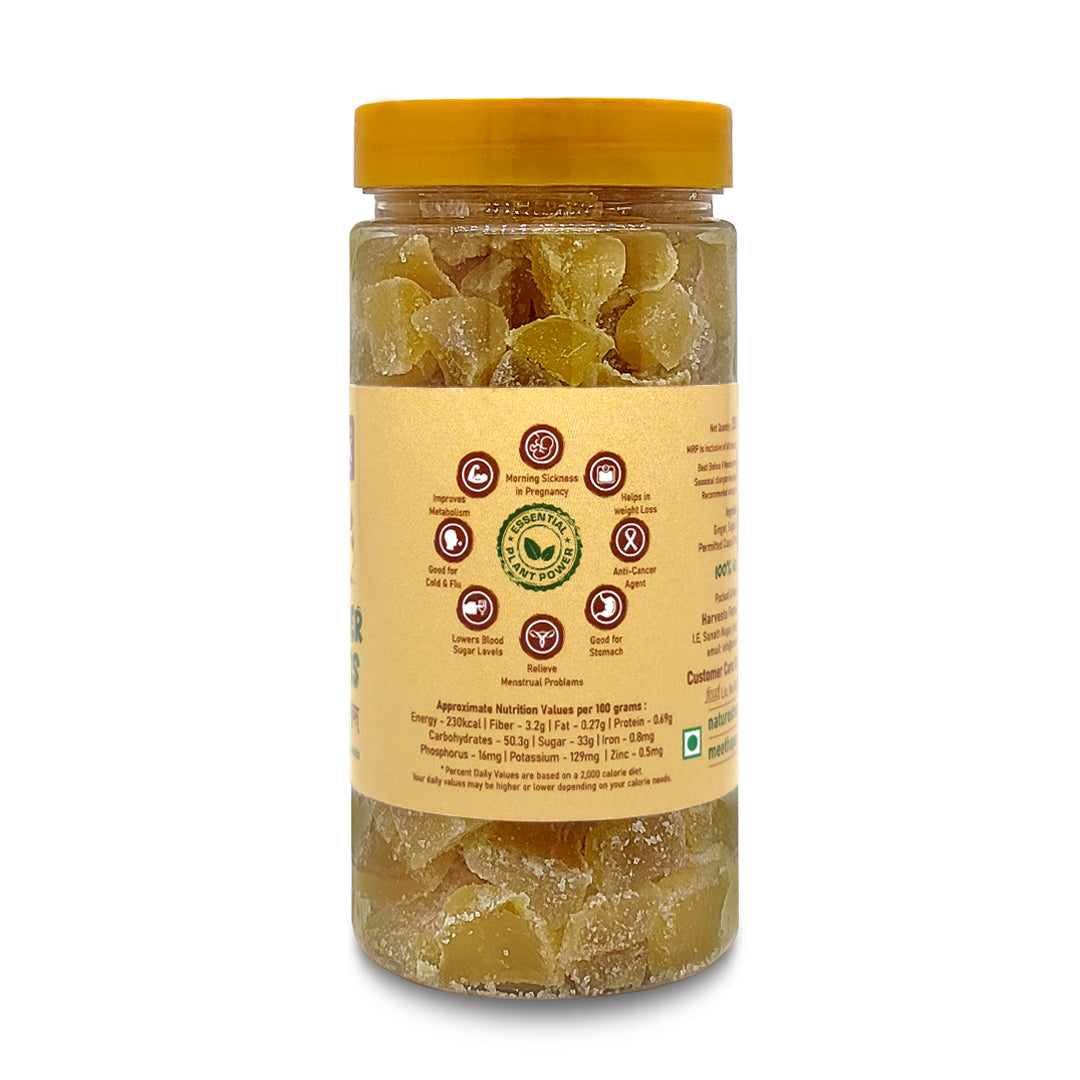 Ginger Candy, is a delightful and nutritious treat made from fresh ginger, offering a spicy, sweet, moist, and chewy texture, packed with essential nutrients and boasting antioxidant and anti-inflammatory properties. It provides a flavourful snack with potential health benefits like metabolism-boosting, and cholesterol-lowering, it also relieves nausea, vomiting, menstrual pain, and morning sickness for pregnant women.