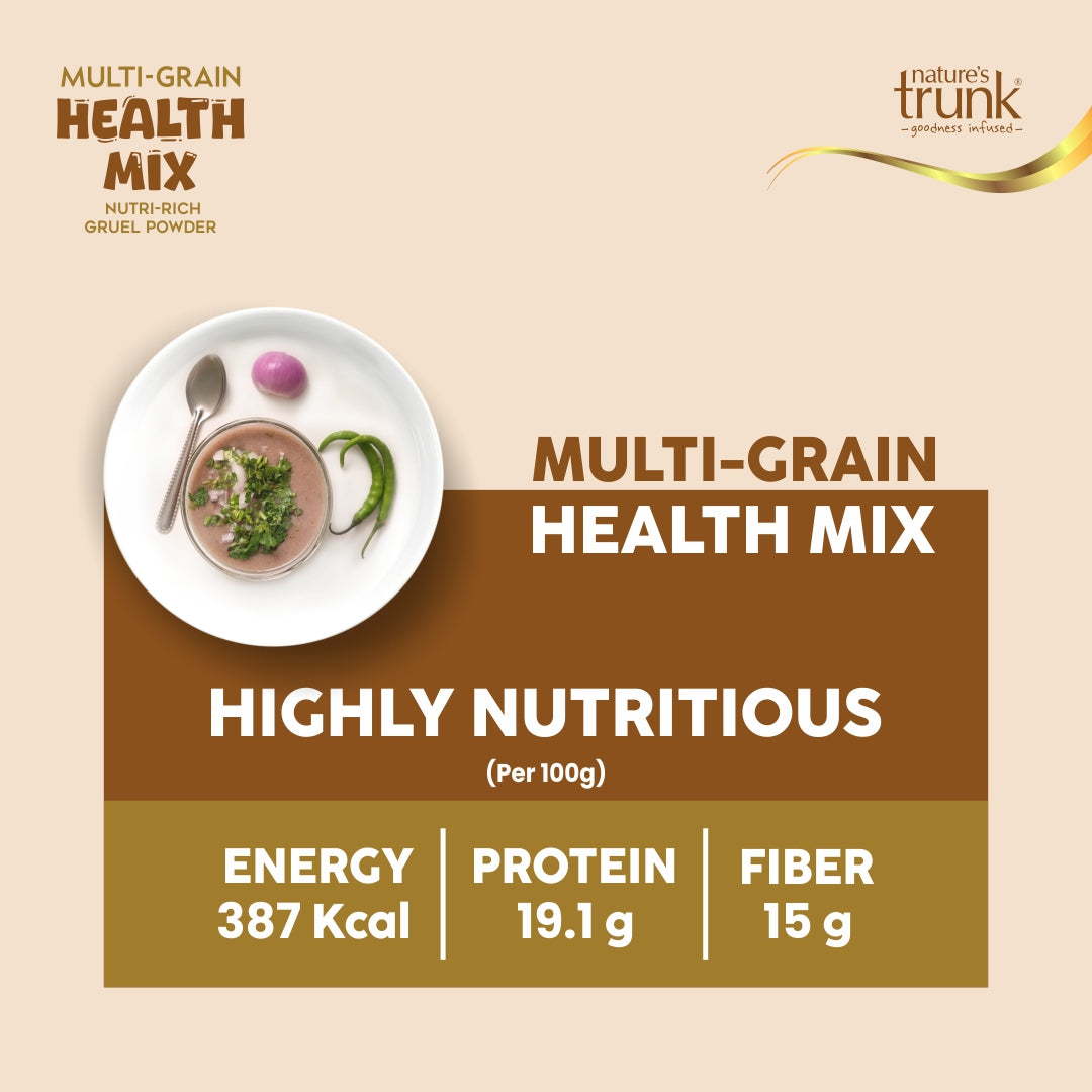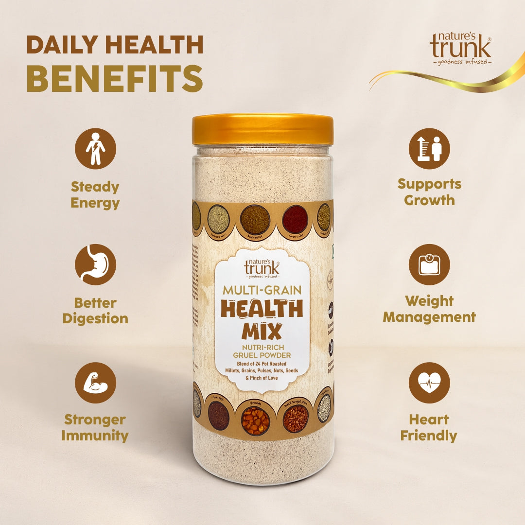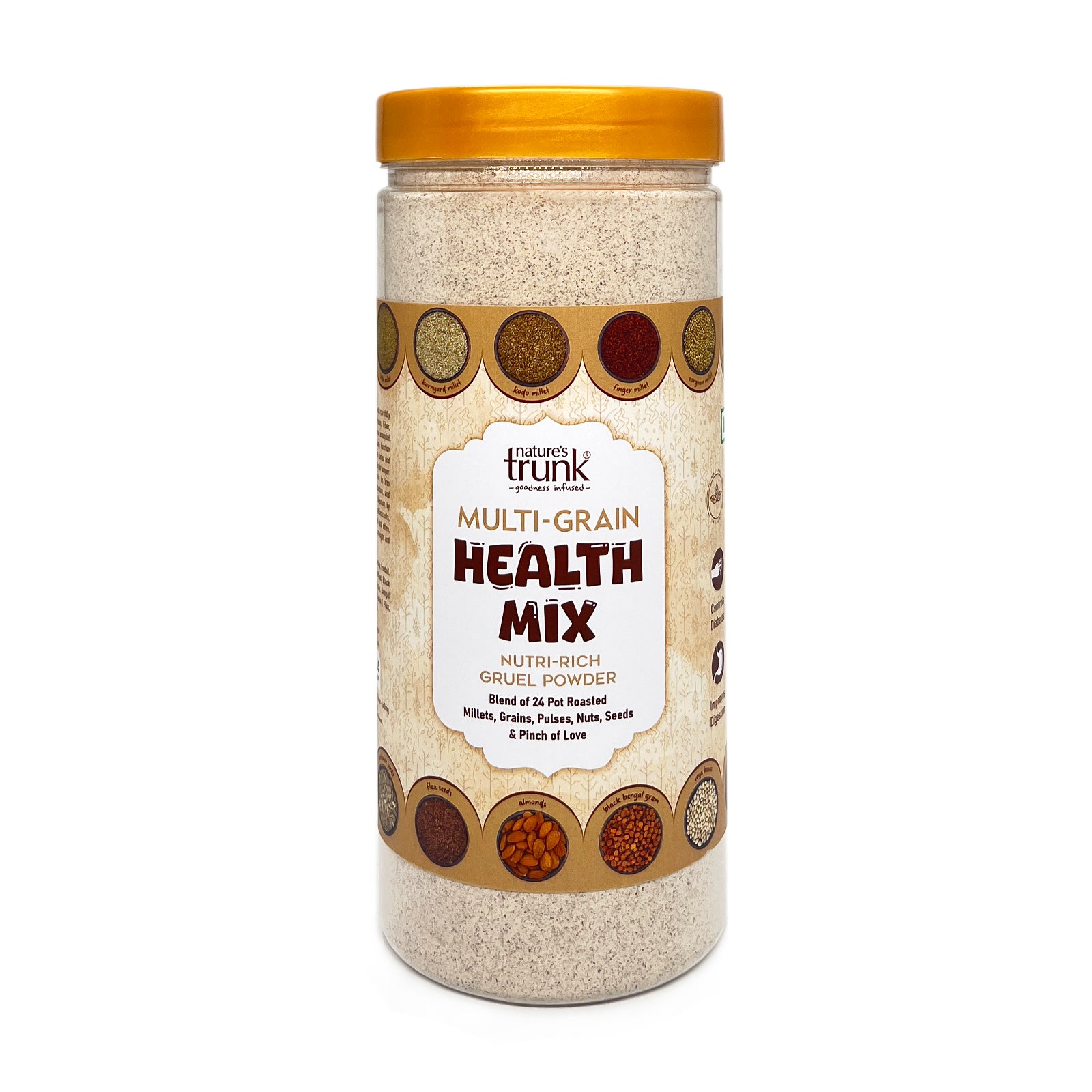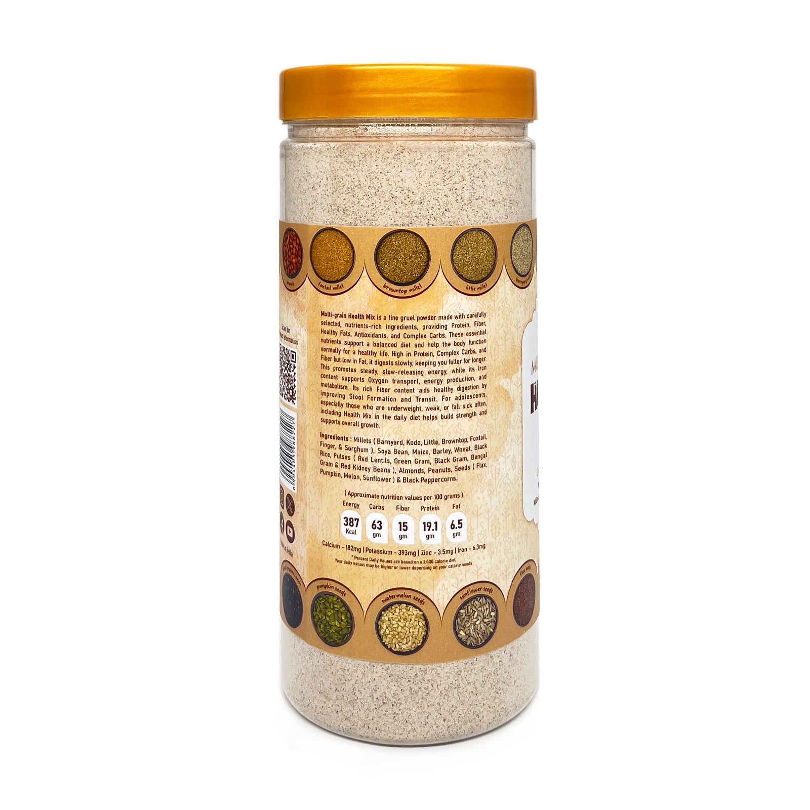 Multi-Grain Health Mix, is a meticulously crafted blend of 24 nutrient-rich ingredients including Millets, Grains, Pulses, Nuts & Cereals that encompass proteins, fiber, antioxidants, healthy fats, and complex carbs. This Gruel Mix is designed to complement a balanced diet, promoting optimal body function and supporting a healthy lifestyle. With a focus on high protein and fiber content, while keeping fats low, it ensures sustained energy release, contributing to a feeling of fullness and aiding in digestion. Health Mix stands out as a versatile and beneficial dietary supplement, especially during growth stages, offering a variety of nutrients essential for overall health and wellness.