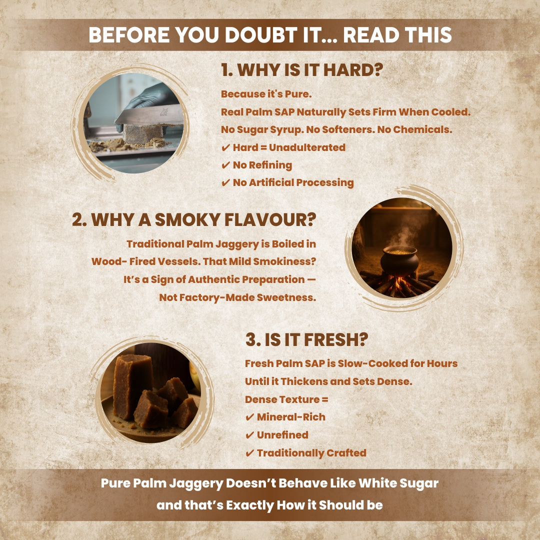 Fresh and Pure: Our Palm Jaggery comes from fresh palm tree juice (SAP), giving you a pure and natural sweet taste.