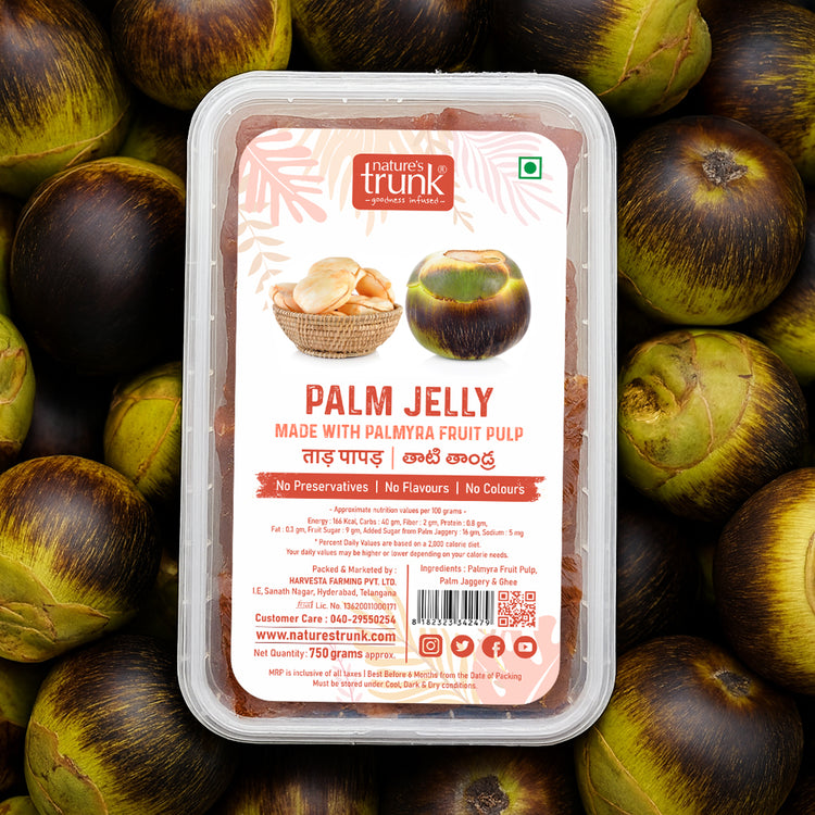 Palm Jelly, also referred to as Tati Tandra or Taad Papad, is a classic delicacy made from palm fruit pulp and jaggery. It undergoes natural drying to maintain its original flavours and nutrients. Our Palmyar Jelly stands out with its distinctive texture and gentle sweetness, serving as a delightful taste experience while furnishing a carbohydrate source of energy. This jelly provides a gentle sweetness along with carbohydrates for energy, boasts a high protein content, and is packed with essential vitamins such as potassium and calcium, which contribute to bone health.