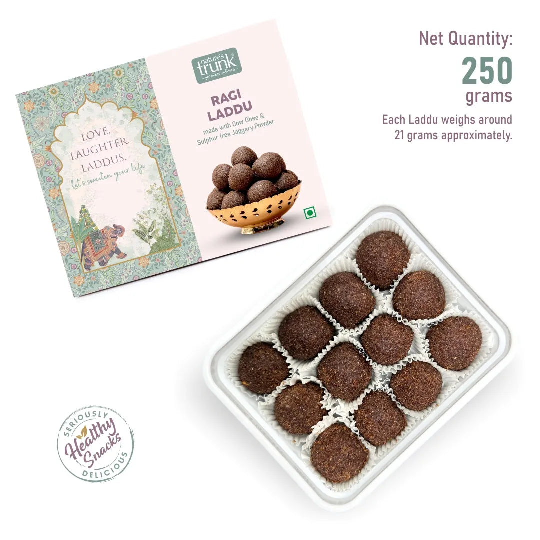 Ragi Laddu is a delightful Indian sweet crafted from the nutritious goodness of Finger Millet (Ragi), combined with the richness of Almonds, Cashew Nuts, and Jaggery Powder. This traditional delicacy is prepared using pure cow ghee and flavoured with aromatic cardamom, creating a perfect balance of taste and health. Each Laddu is lovingly handcrafted to ensure exceptional quality and flavour, making it an ideal choice for those seeking a wholesome indulgence.